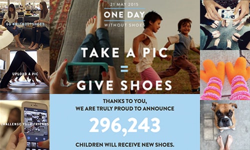 TOMS, a commercial based company in Playa Del Ray, California, launched its commemorated, One Day Without Shoes Campaign back in 2015. This campaign sought to give a pair of shoes for each "bare foot" photo that was uploaded on Instagram using the hashtag #withoutshoes. Both customers and non customer could participate in this outreach campaign, and were inspired to spread the news. Over the course of 2 weeks, participants from all over the world were able to donate 296,243 shoes to children who were in need.